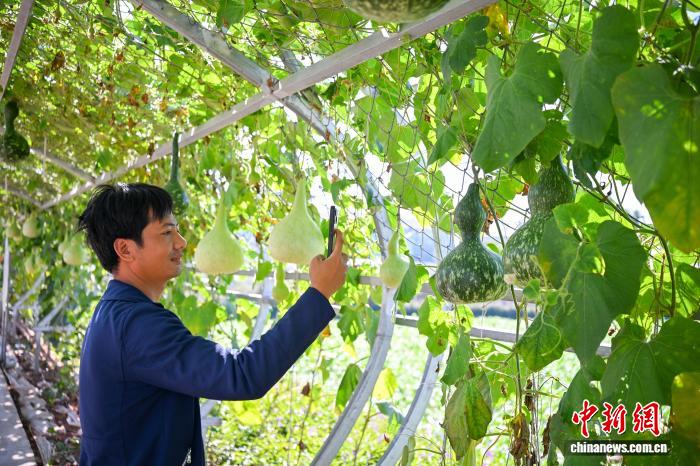 12月9日,2025云北·元谋第9届蔬菜种业展览会正在云北省楚雄彝族自制州元谋县落幕,百余家著名种业、农资、农机、栽种企业散中明相。图为藤蔓上的葫芦吸收不雅寡。中新社记者 刘冉阳 摄